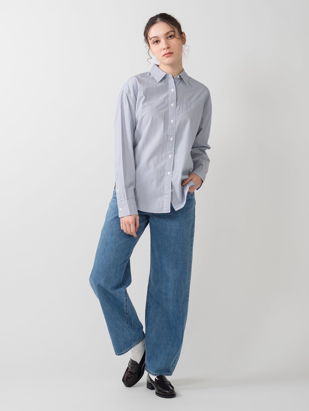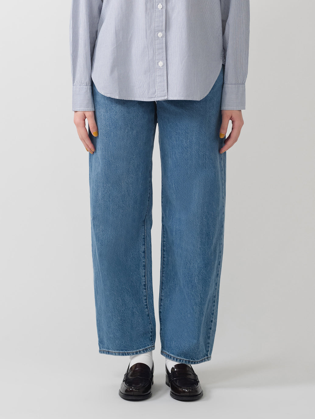 お父さんから借りたジーンズよりもバギーなジーンズがトレンドのカラーでデザインされました。リラックス感のあるミッドライズのストレートレッグジーンズ。余裕を持たせ、さりげなくエッジィな雰囲気にすることで、ゆったりしながらもシルエットが引き立ちます。お気に入りのスニーカーと合わせれば、いつでもクールな90年代のルックを楽しめます。どんなトップスとも相性抜群のこれからの季節にピッタリなカラーで登場しました。