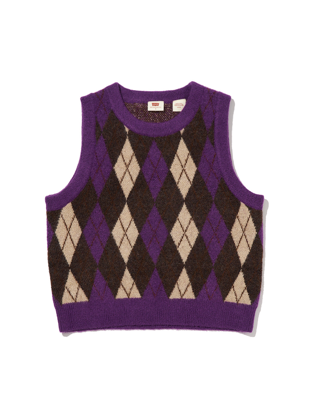 アーガイル柄が目を引くクラシックなベスト。アクリルとポリエステルを使用しており、いつまでも触っていたくなるようなソフトな素材で着心地も抜群です。どんなデニムとも相性抜群の一枚です。