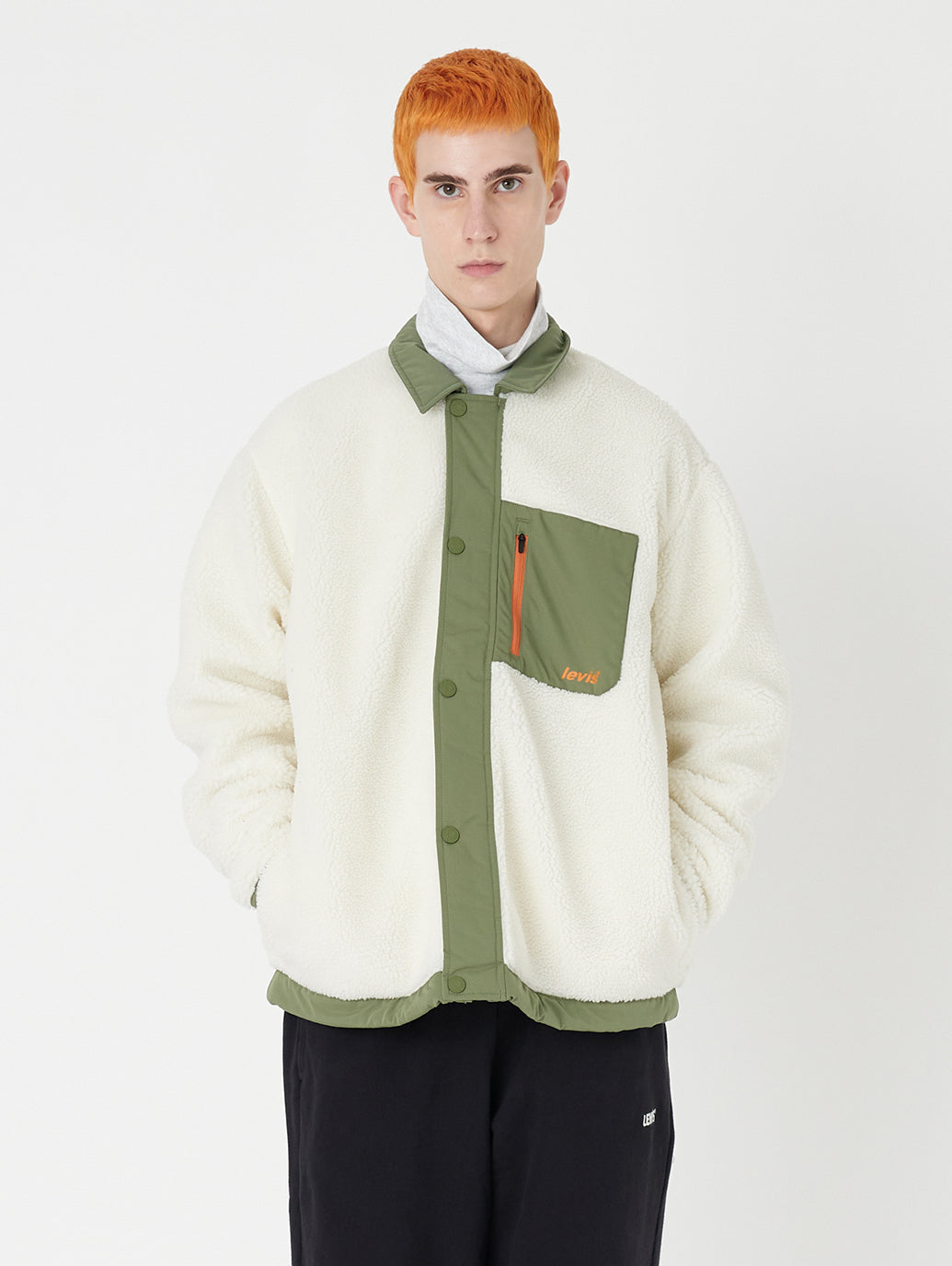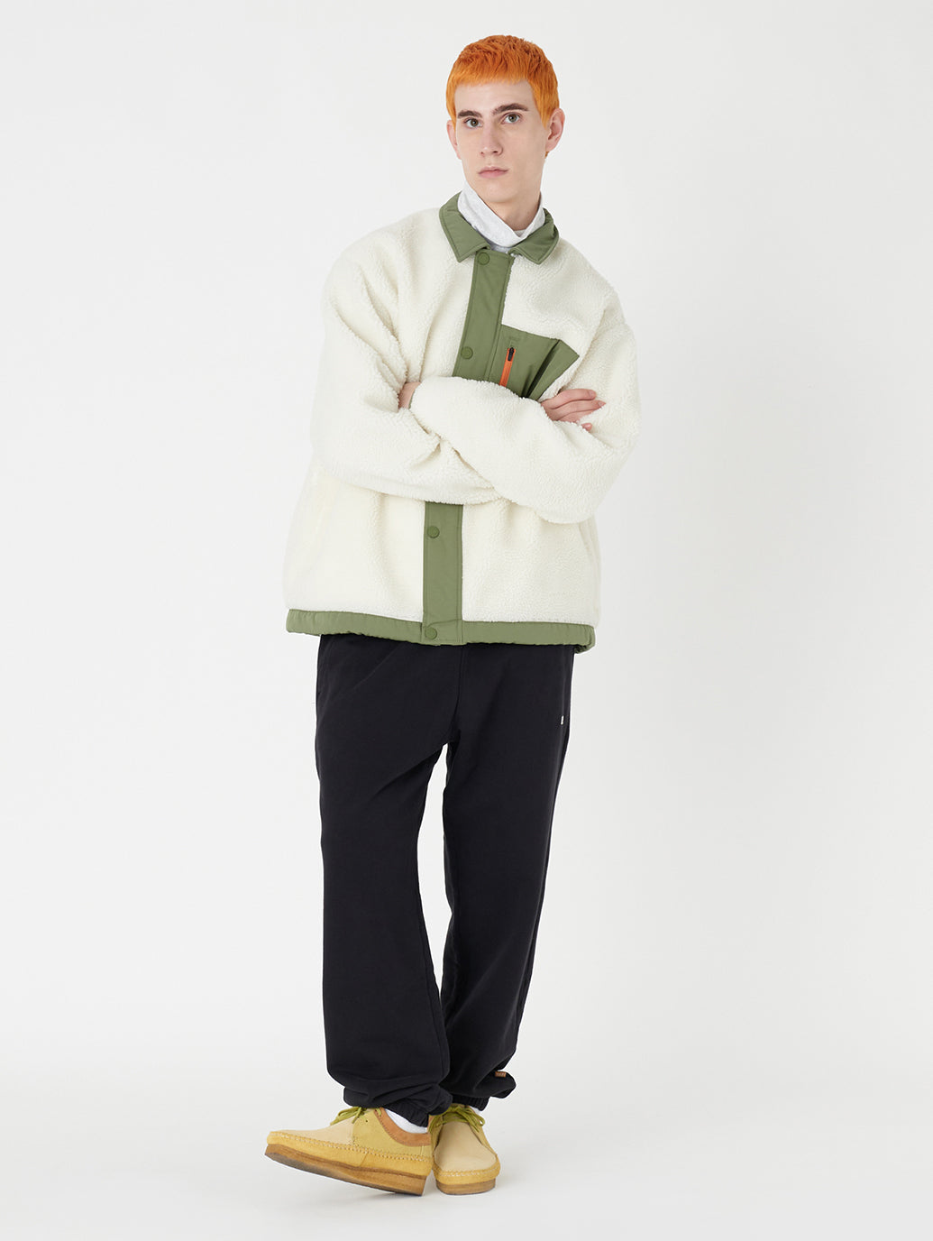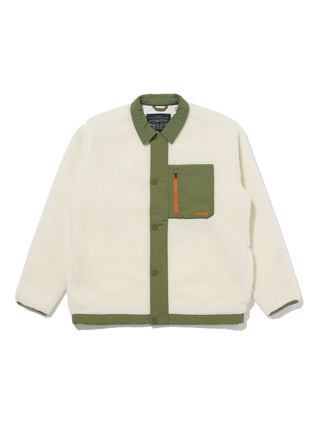 シャツとコーチジャケットを兼ね添えたジャケット。ミリタリーテストを感じるオフホワイトとオリーブカラーのボディ、ボタンダウンのフロント、リラックスフィット、ジップ式胸ポケット、そして流行り廃りのないシャツデザインで、便利で着心地のよいレイヤーとして使える一着です。