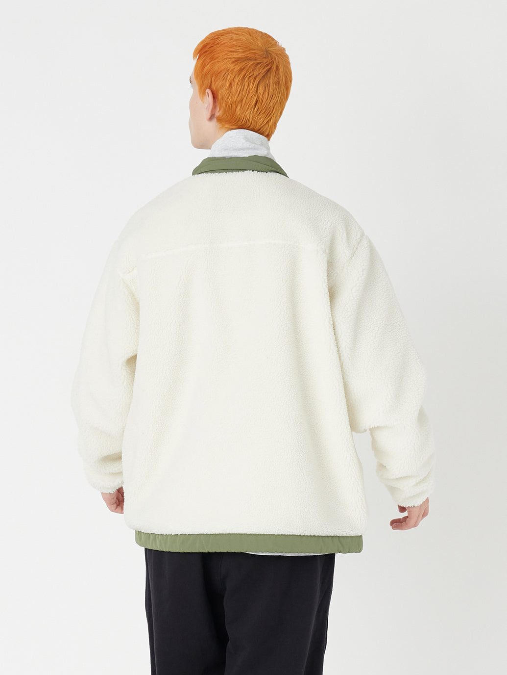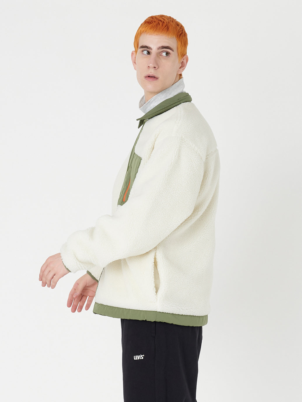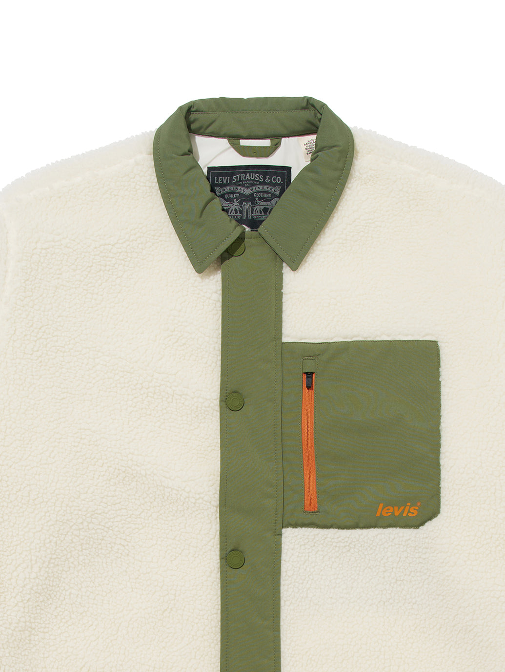 シャツとコーチジャケットを兼ね添えたジャケット。ミリタリーテストを感じるオフホワイトとオリーブカラーのボディ、ボタンダウンのフロント、リラックスフィット、ジップ式胸ポケット、そして流行り廃りのないシャツデザインで、便利で着心地のよいレイヤーとして使える一着です。