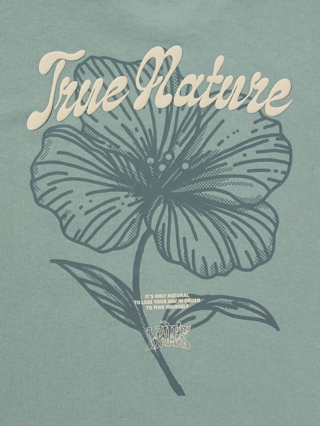 夏に大活躍するTシャツ。通常の袖の長さより少し長めに作られているのが特徴です。 ゆったりとしたフィット感でレトロな雰囲気のカラーにハイビスカスのプリントが大胆にあしらわれています。