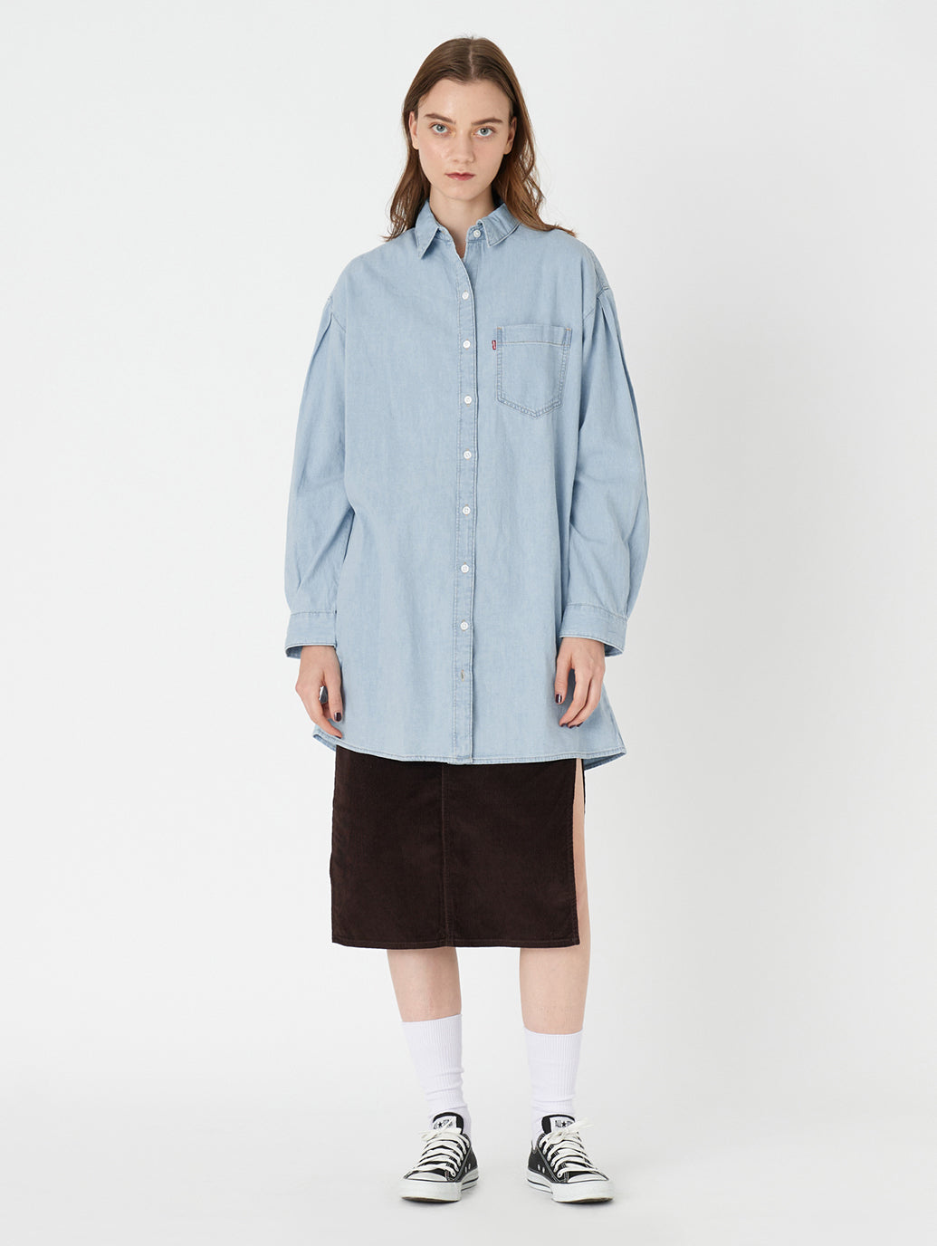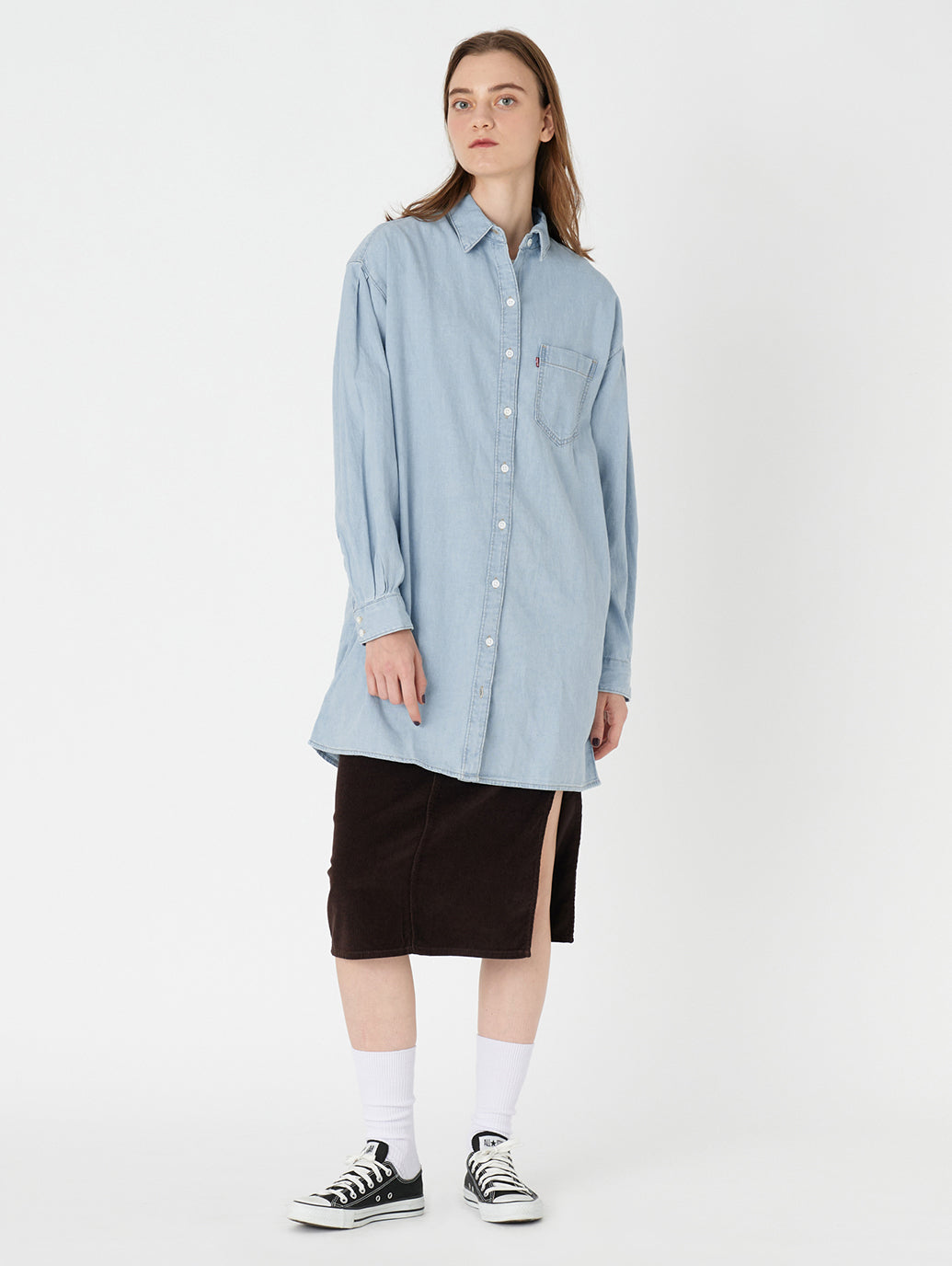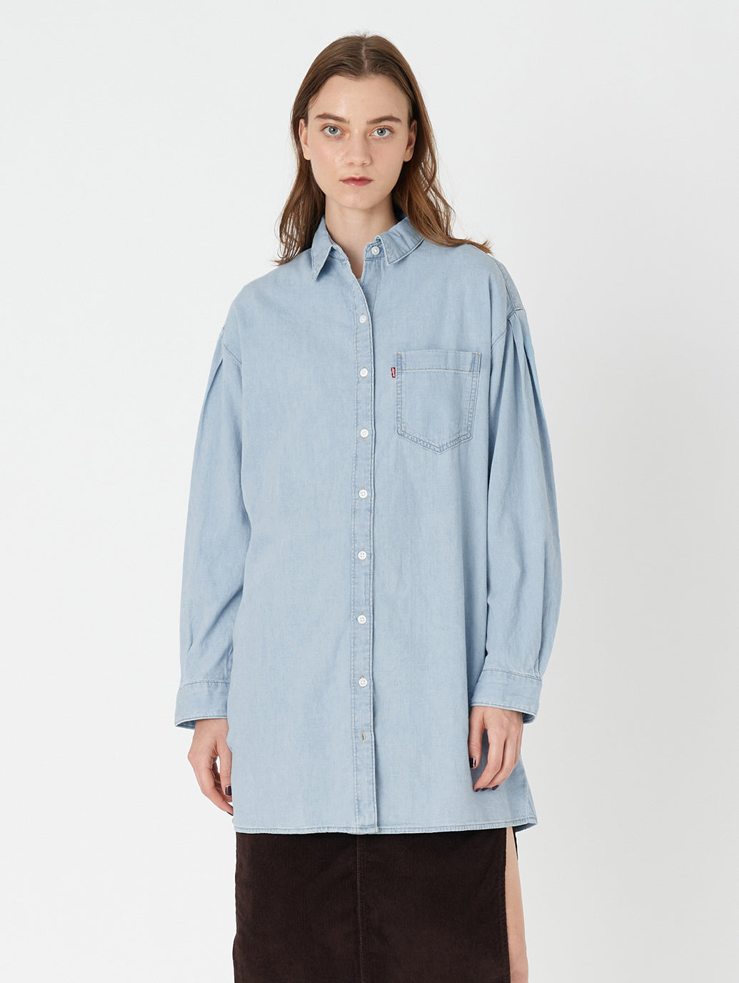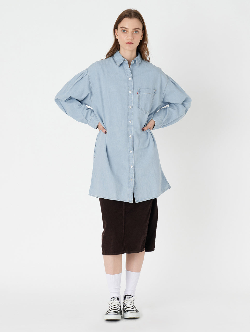 大人気のデニム素材のワンピースが登場しました。 クラシックなポイントカラー、ゆったりした長袖、ボタンアップのフロント、程よい長さのミニ丈のデザインです。ドレスアップでもカジュアルでもOK。トレンドらしくワイドなパンツとアウトフィットを組んだり、細みのボトムスと合わせてクラシックに着用したり汎用性の高いマストハブアイテムです。