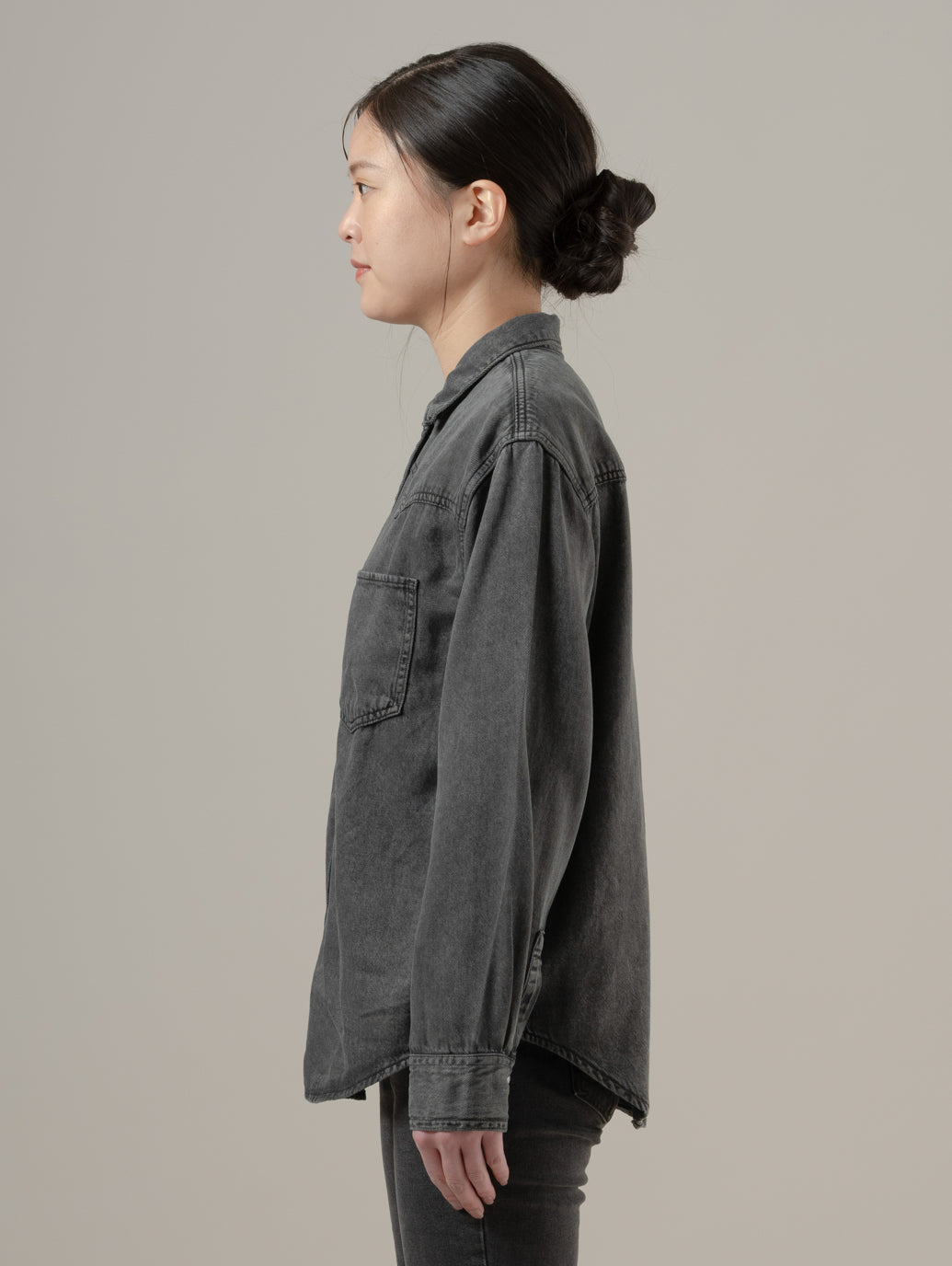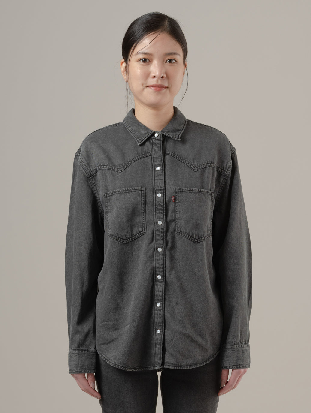 定番のウエスタンシャツをフェミニンにアレンジしたデニムシャツが登場しました。クラシックなスナップボタンのフロント、2つのパッチポケット、ウエスタンテイストのヨークデザインを採用し、ゆったりとしたフィットに仕上げています。どんなボトムスとも相性抜群の一枚です。 model:167cm B74 W61 H88 着用サイズ:S