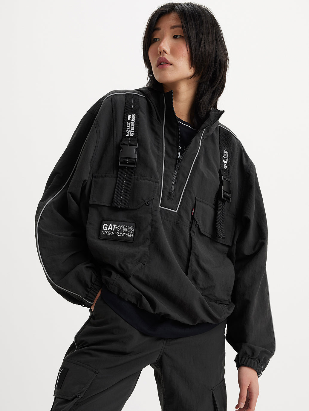 身幅がゆったりとしたボクシーフィットのブラックカラーボディのナイロンジャケット。シルバーのパイピング、オーバーサイズのユーティリティ・チェストポケット、調節可能なストラップ、背中の大きなGAT-X105ストライクガンダムのグラフィックが特徴的な当コレクションなれでは拘りのデザインです。機能性にも優れており幅広い季節に活躍する一着です。