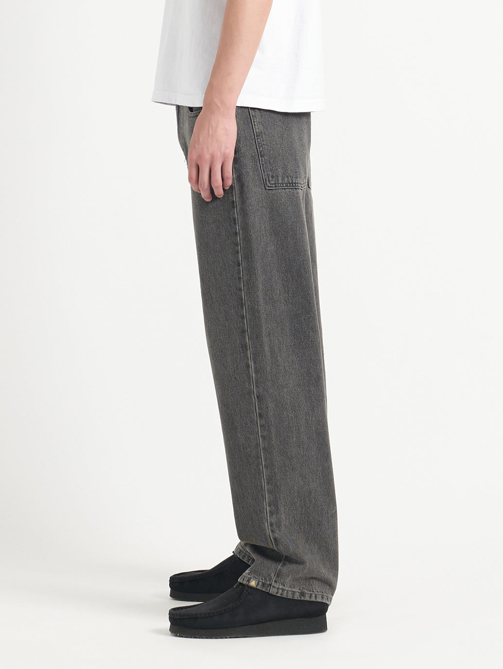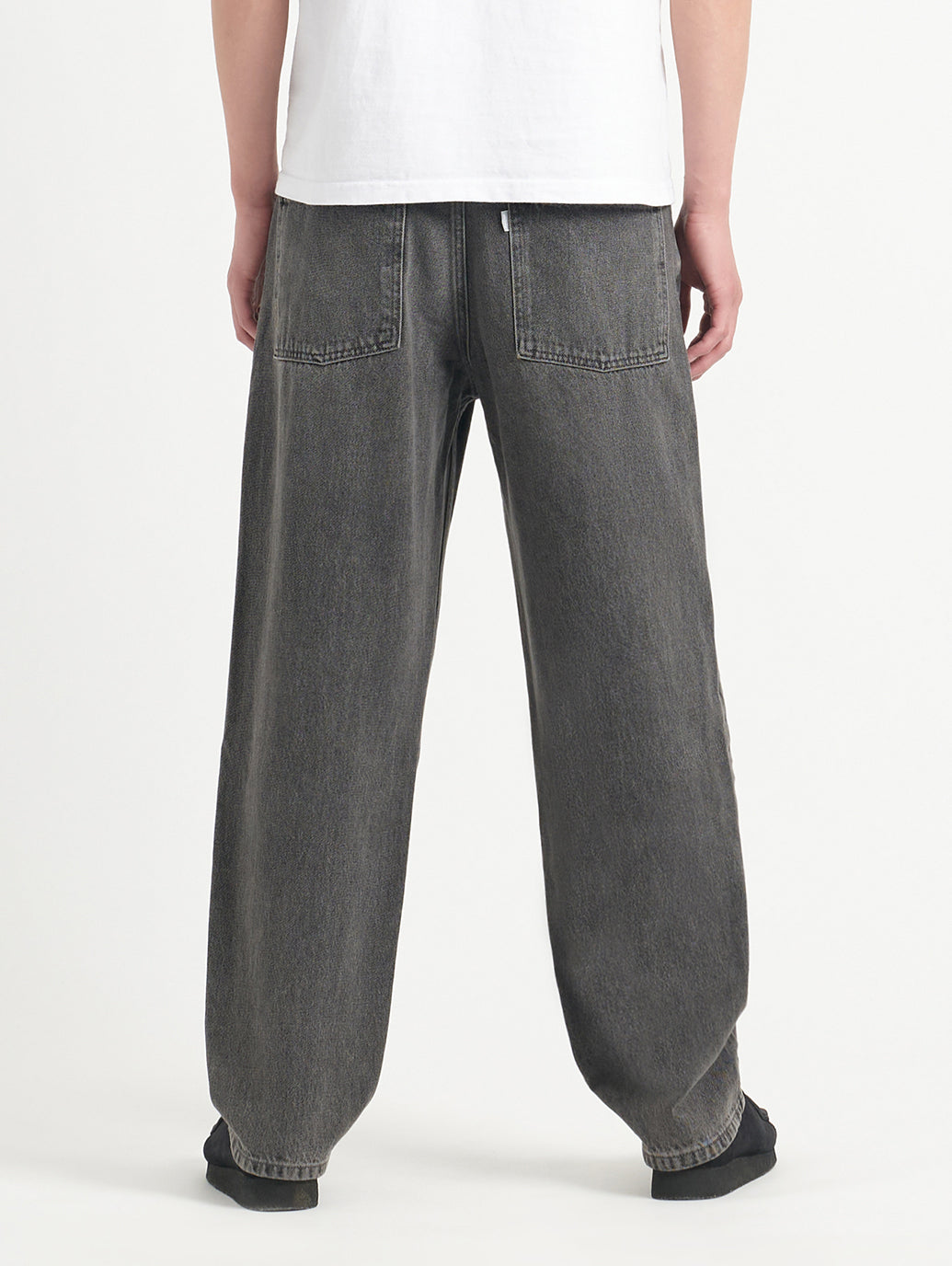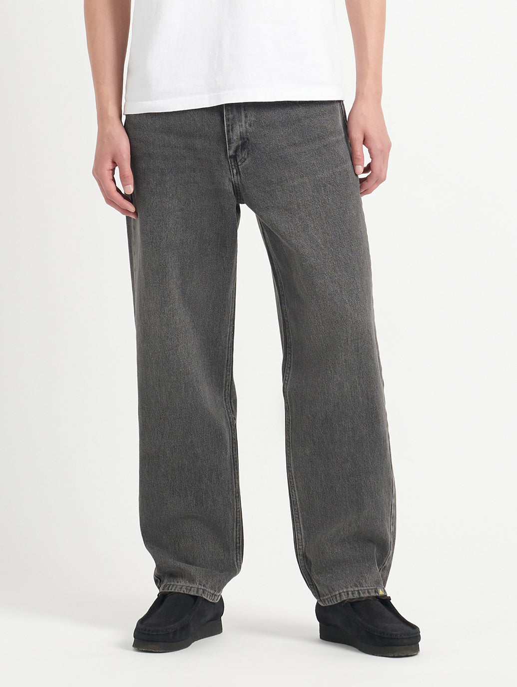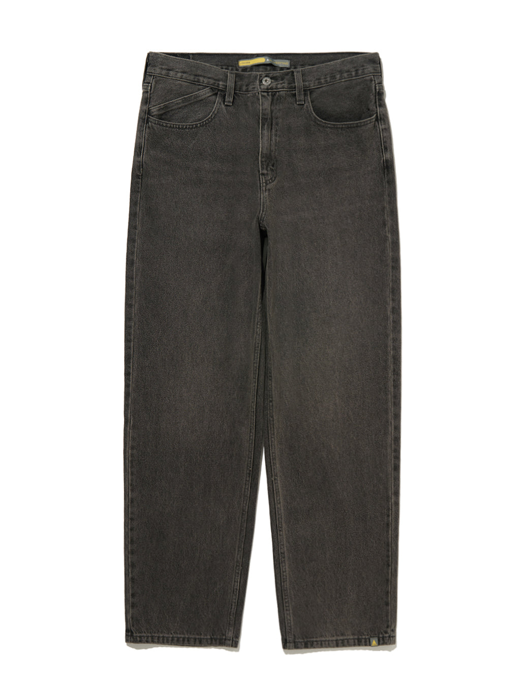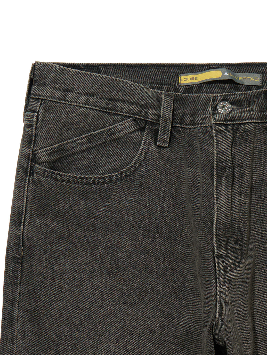 SILVERTAB™を代表するフィットの一つである「LOOSE」。全体的にルーズでゆとりがありながらも、裾に向かって細くなるテーパードになっているので足元が引き立つのが魅力のシルエット。ブラックユーズドカラーは90年代を感じさせるいなたさと雰囲気のあるジーンズです。足元にボリュームを出しながら穿いて頂くのがオススメです。