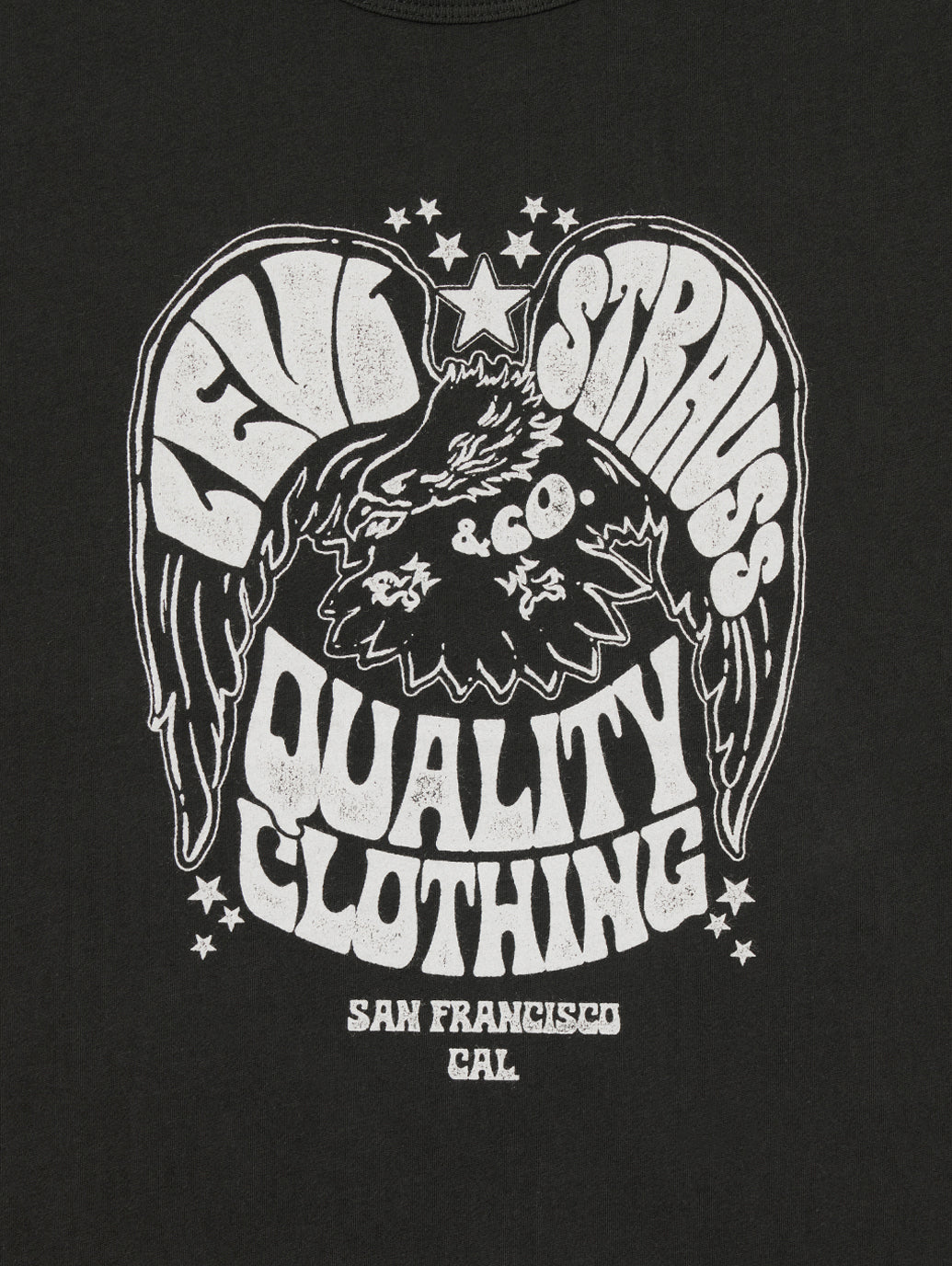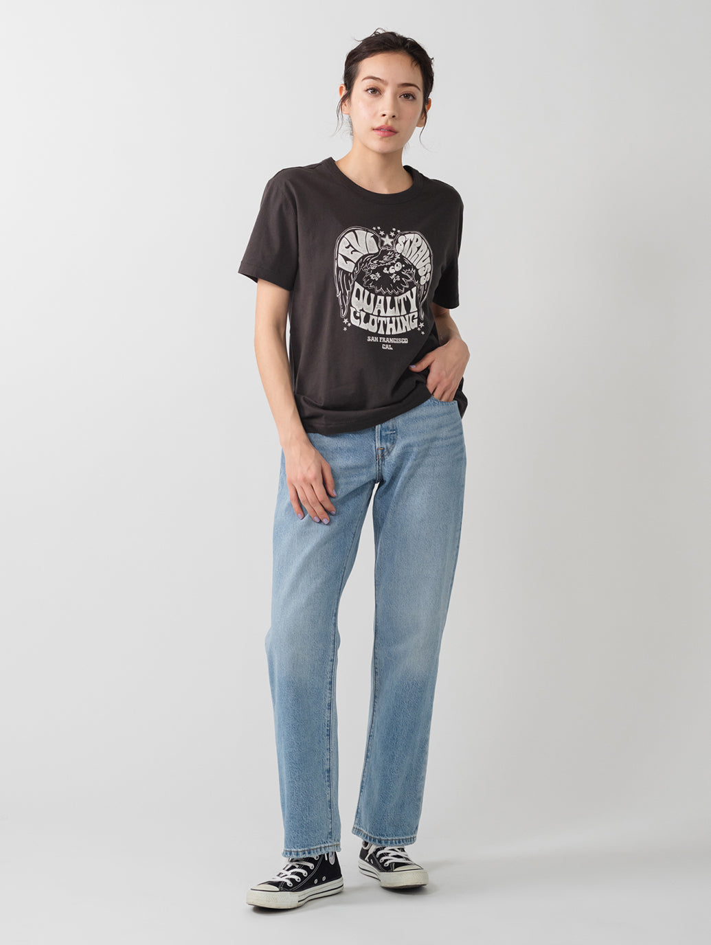 クラシックなクルーネックでスタンダードフィットのTシャツ。グレーカラーのボディのフロントにグラフィックを施したデザインです。春先には羽織もののインナーとして、夏にはスタイリングの主役として活躍する一枚です。