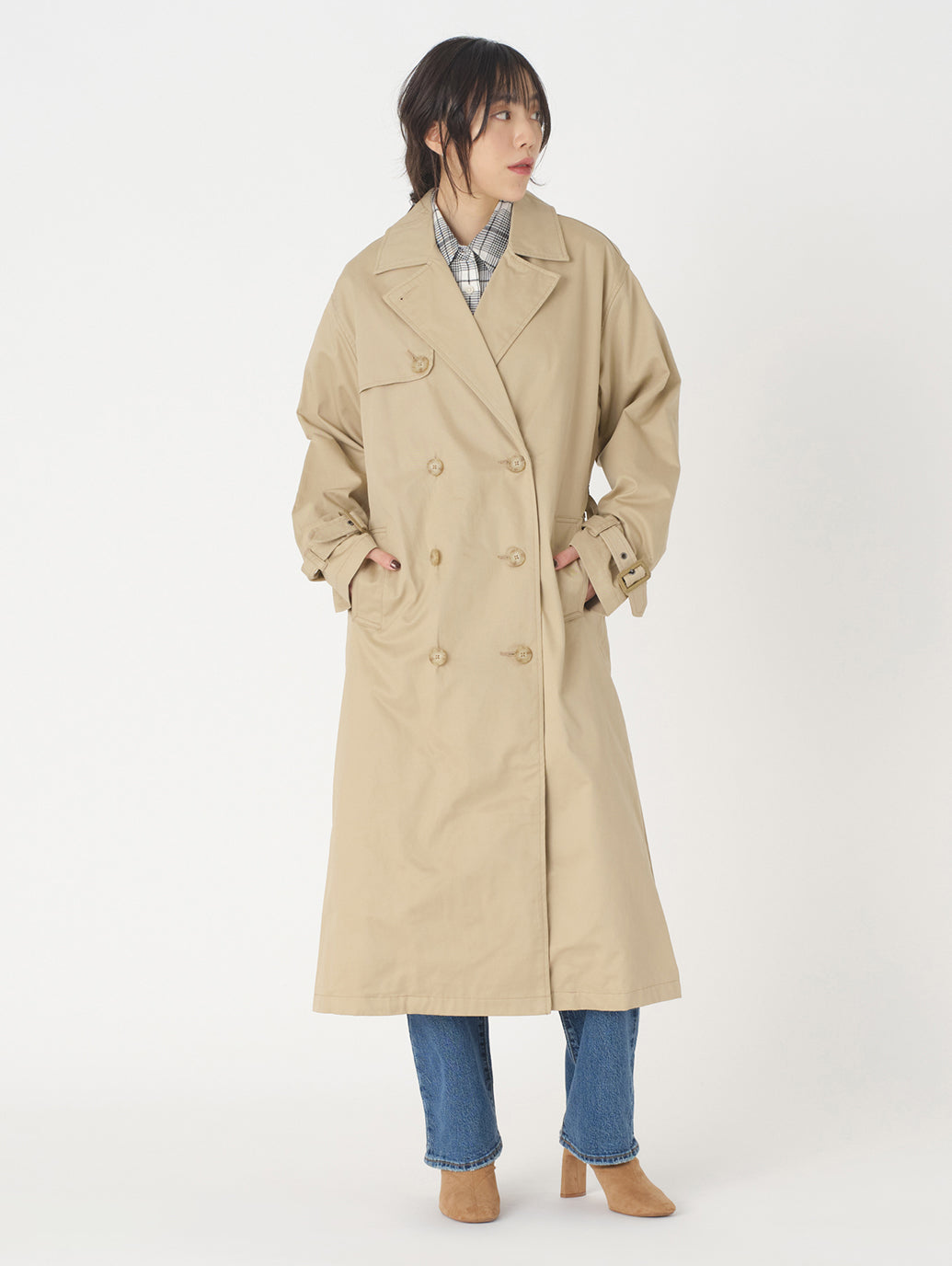 カジュアルにつかえるトレンチコートが登場しました。クラシカルなピークドラペルの襟、ロングラインのシルエット、両サイドのポケット、そしてウエストのベルトできゅっと締めてスタイルを楽しめる一枚です。