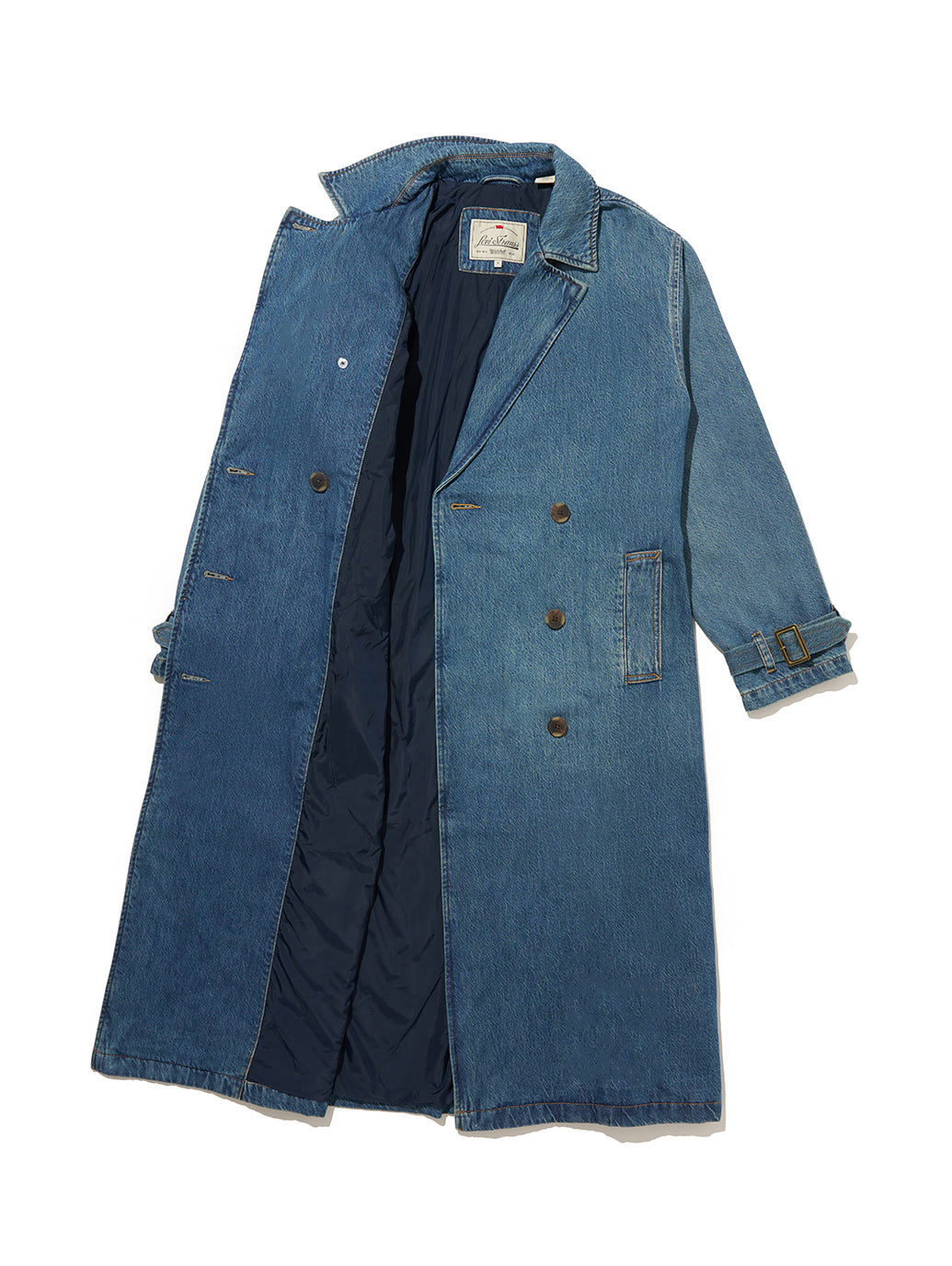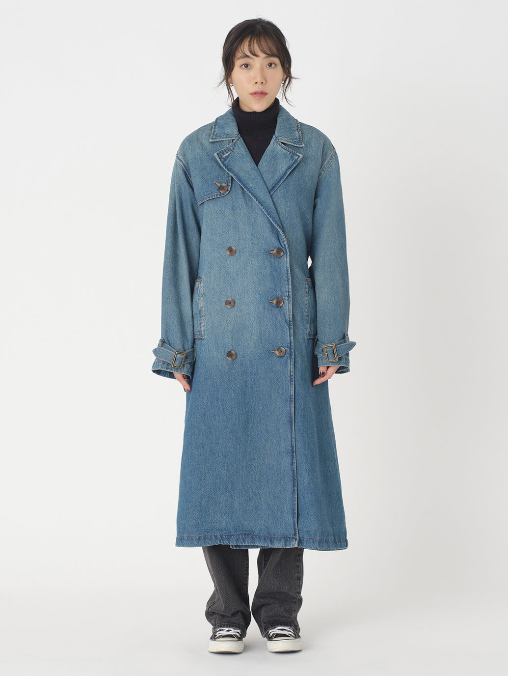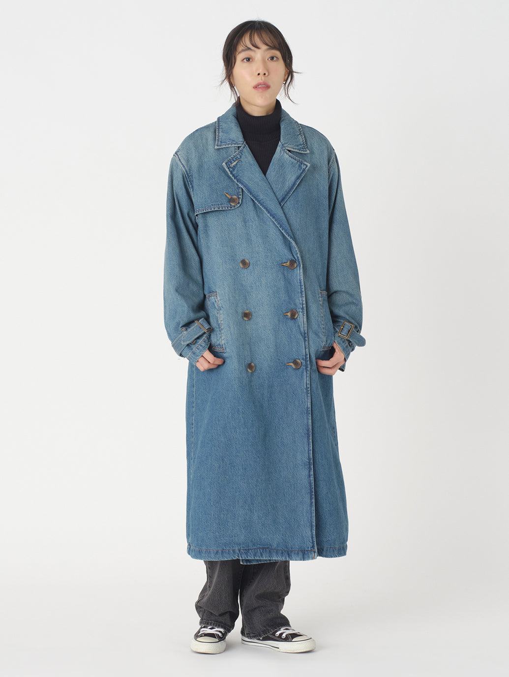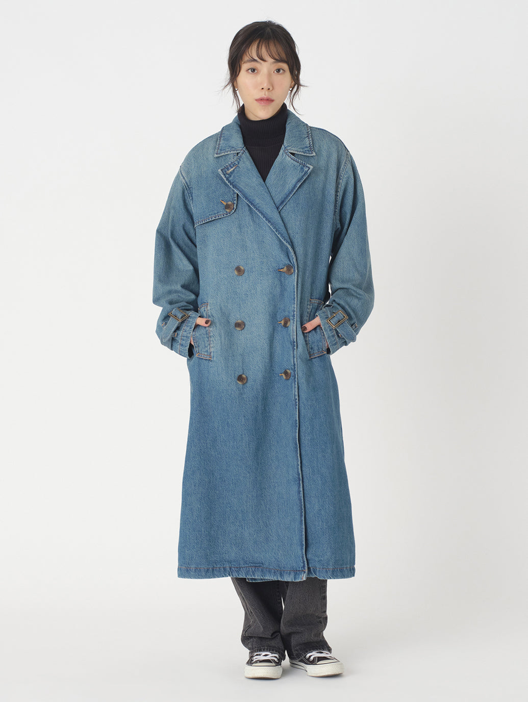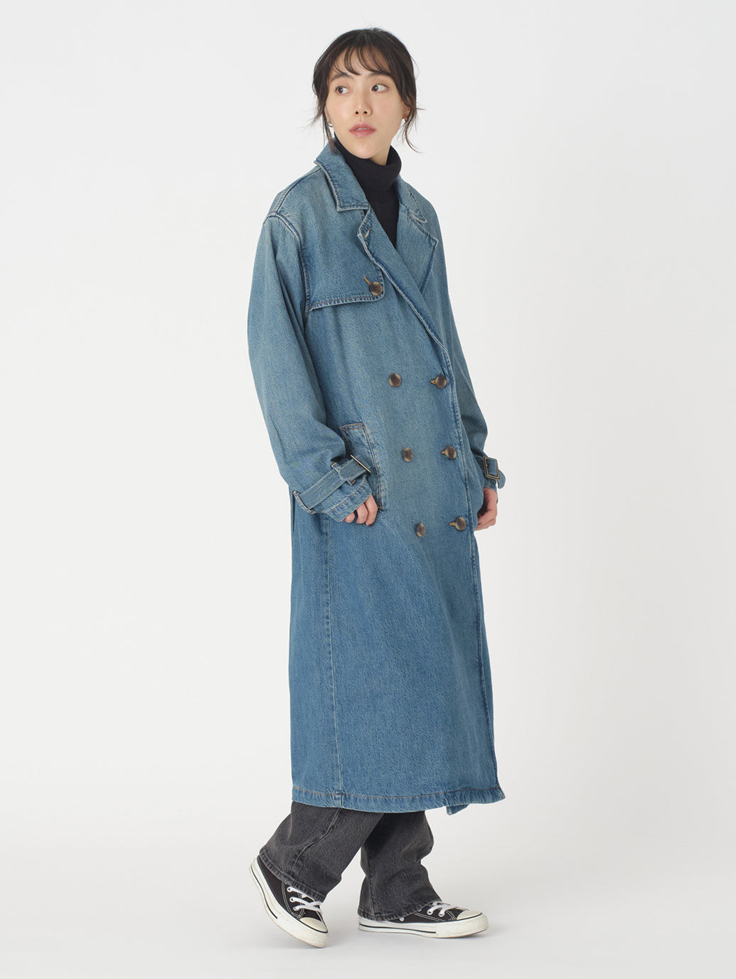 カジュアルにつかえるトレンチコートがデニム素材で登場しました。クラシカルなピークドラペルの襟、ロングラインのシルエット、両サイドのポケット、そしてウエストのベルトできゅっと締めてスタイルを楽しめる一枚です。