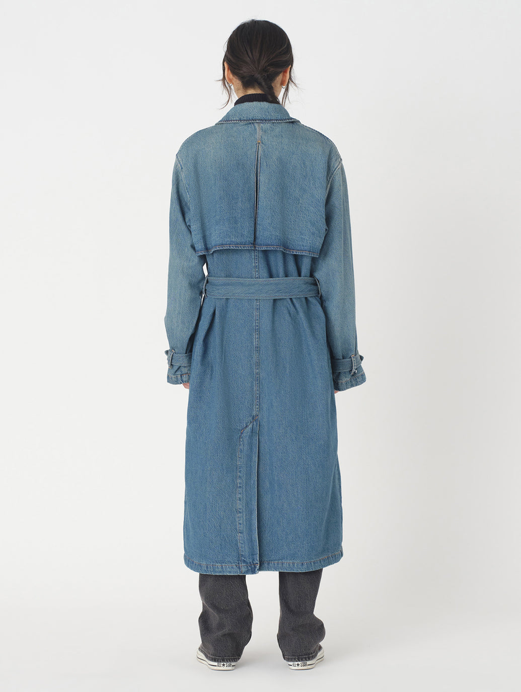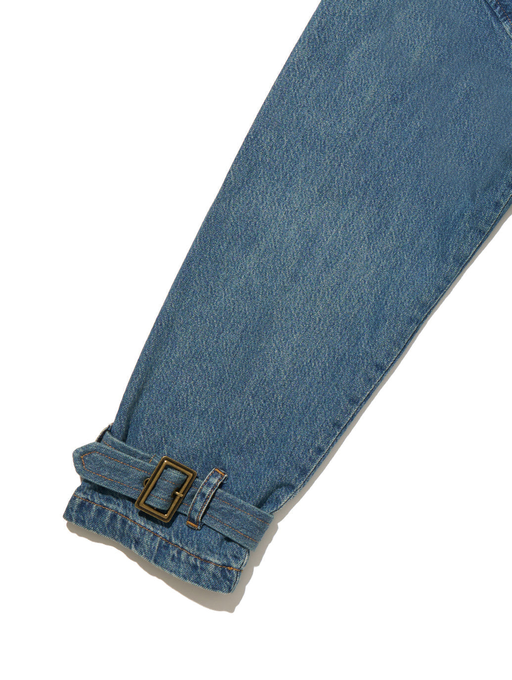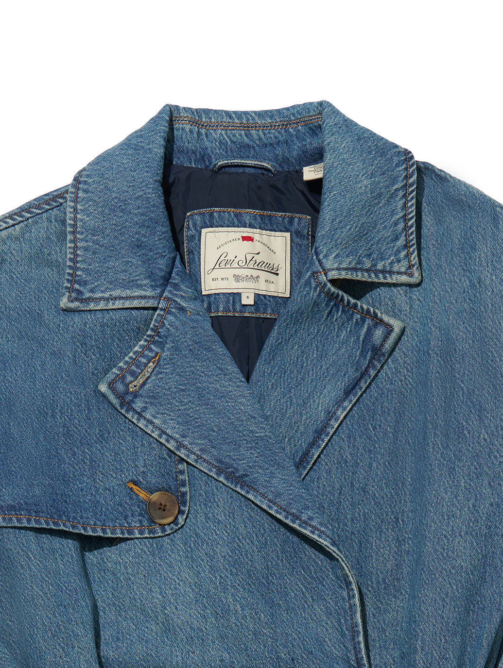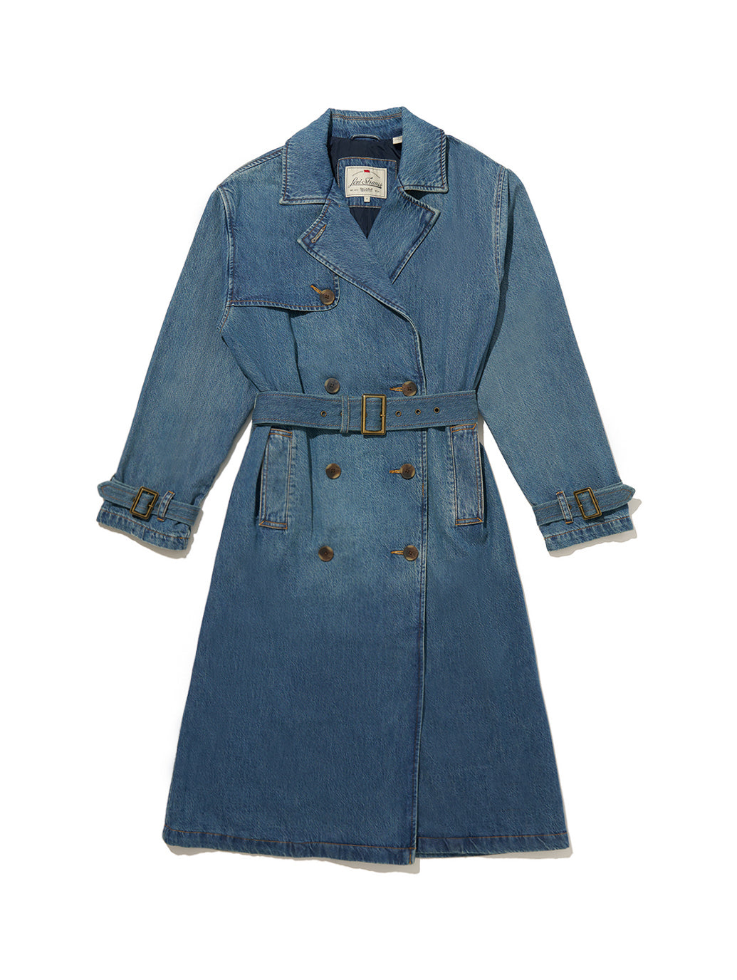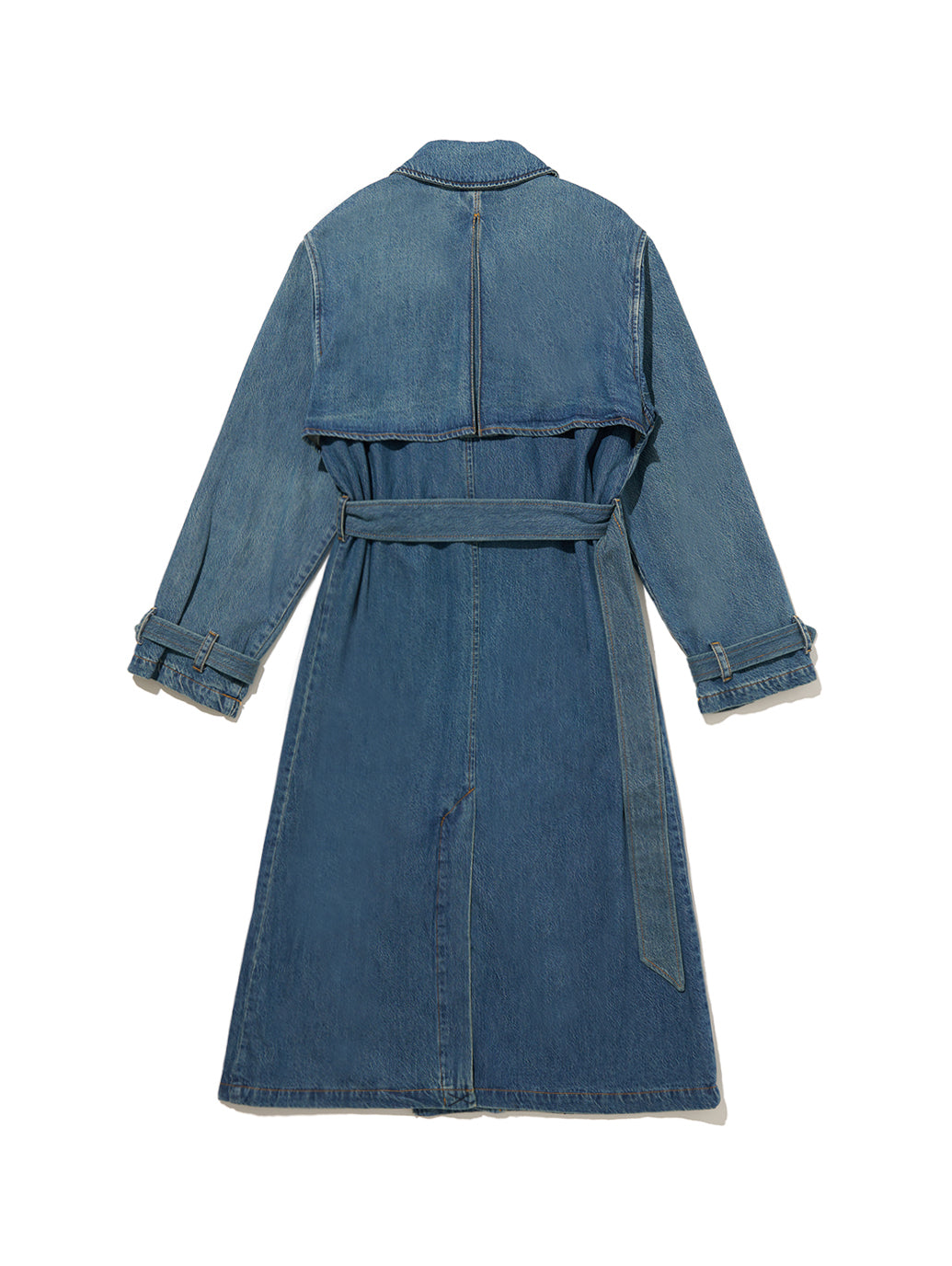 カジュアルにつかえるトレンチコートがデニム素材で登場しました。クラシカルなピークドラペルの襟、ロングラインのシルエット、両サイドのポケット、そしてウエストのベルトできゅっと締めてスタイルを楽しめる一枚です。