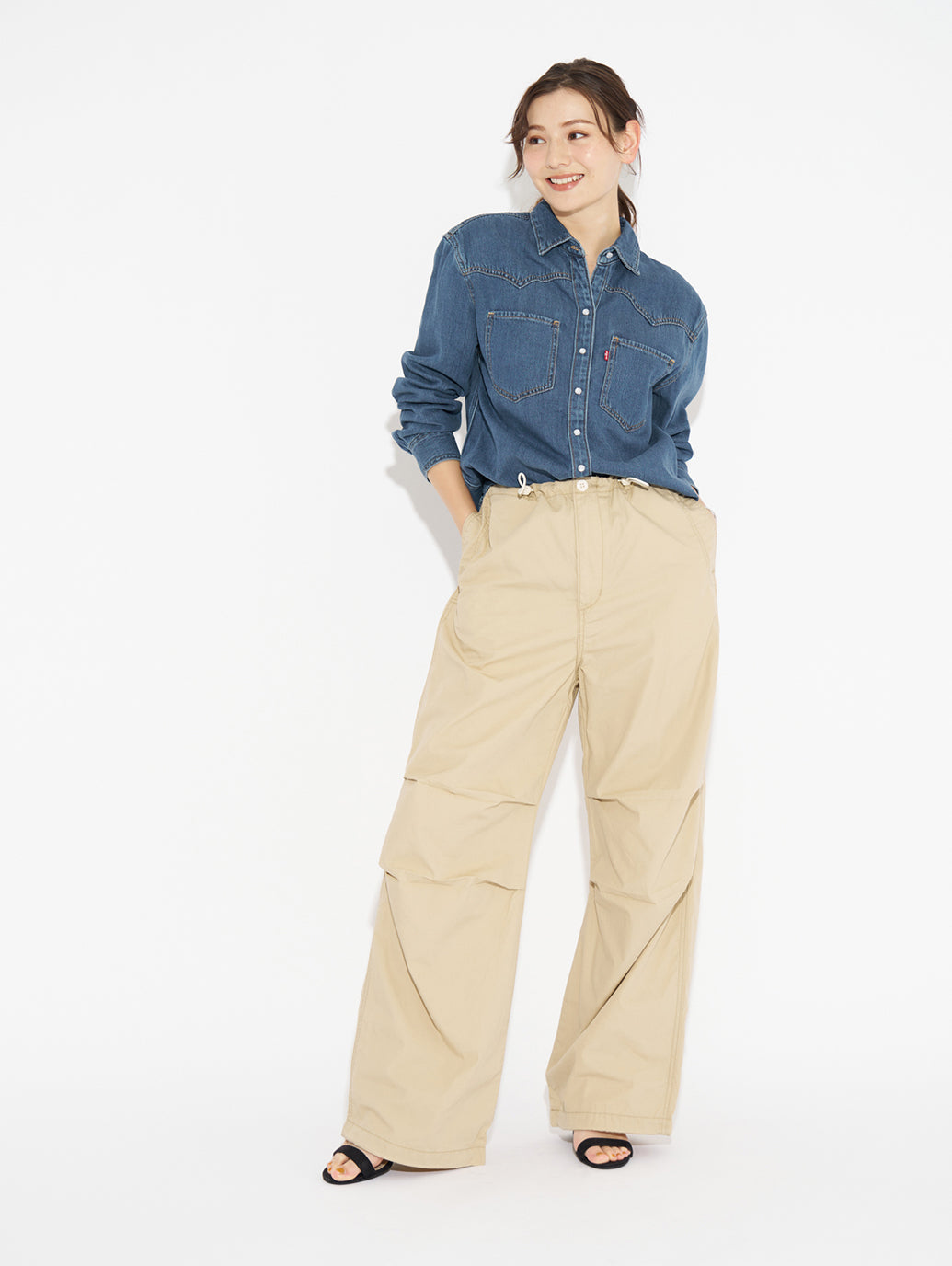 トレンド感の強いデニム素材以外のボトムスが登場しました。脚長効果を生み出すワイドレッグに仕上げたウエスト穿きのミッドライズパンツです。トレンド感の強い個性的な一本です。色違いで欲しくなる優れもの。