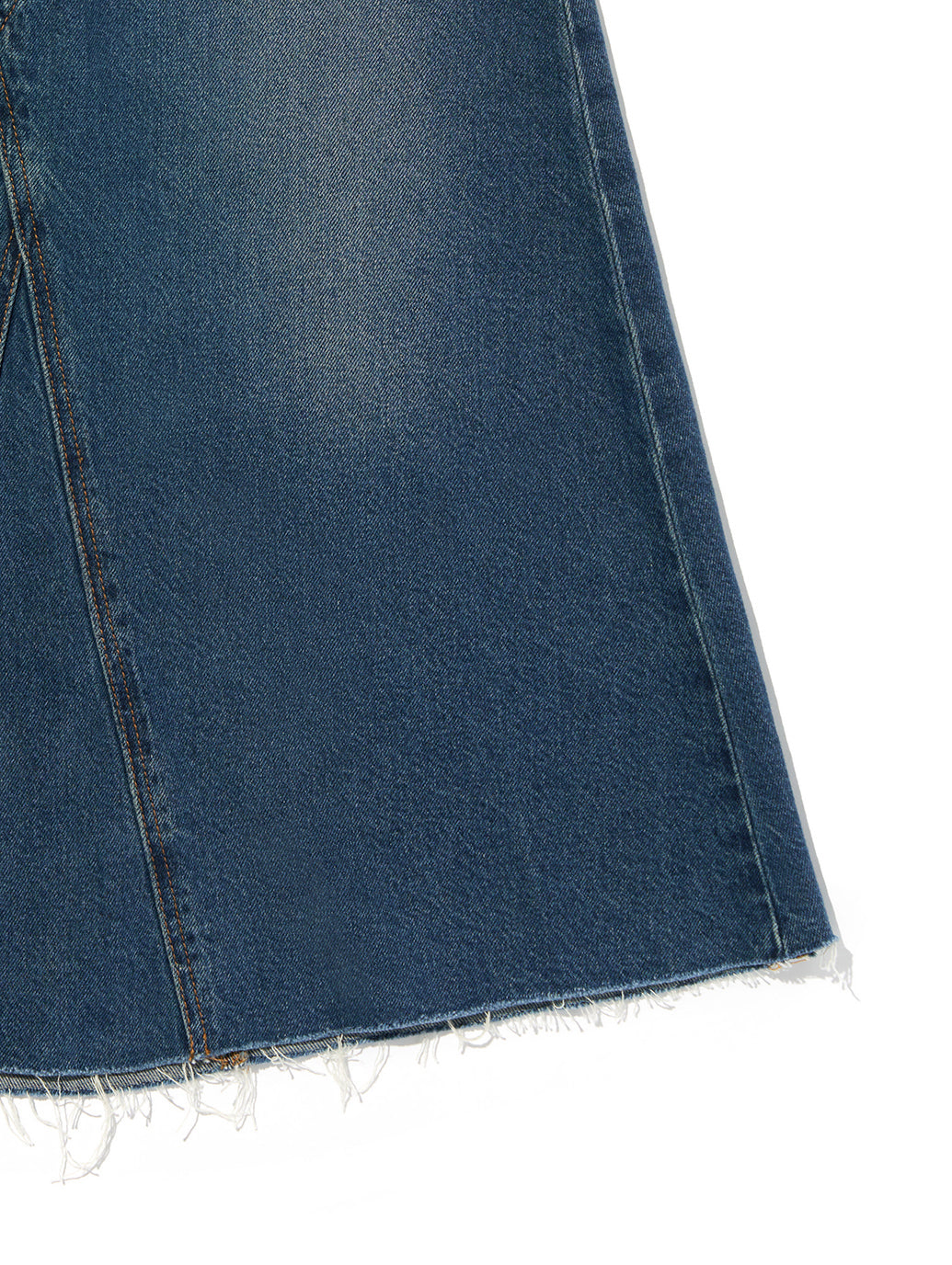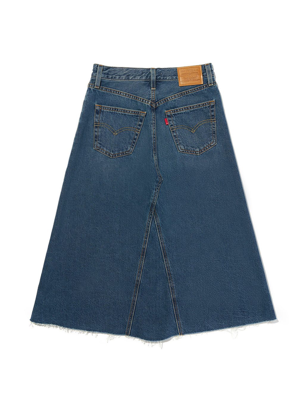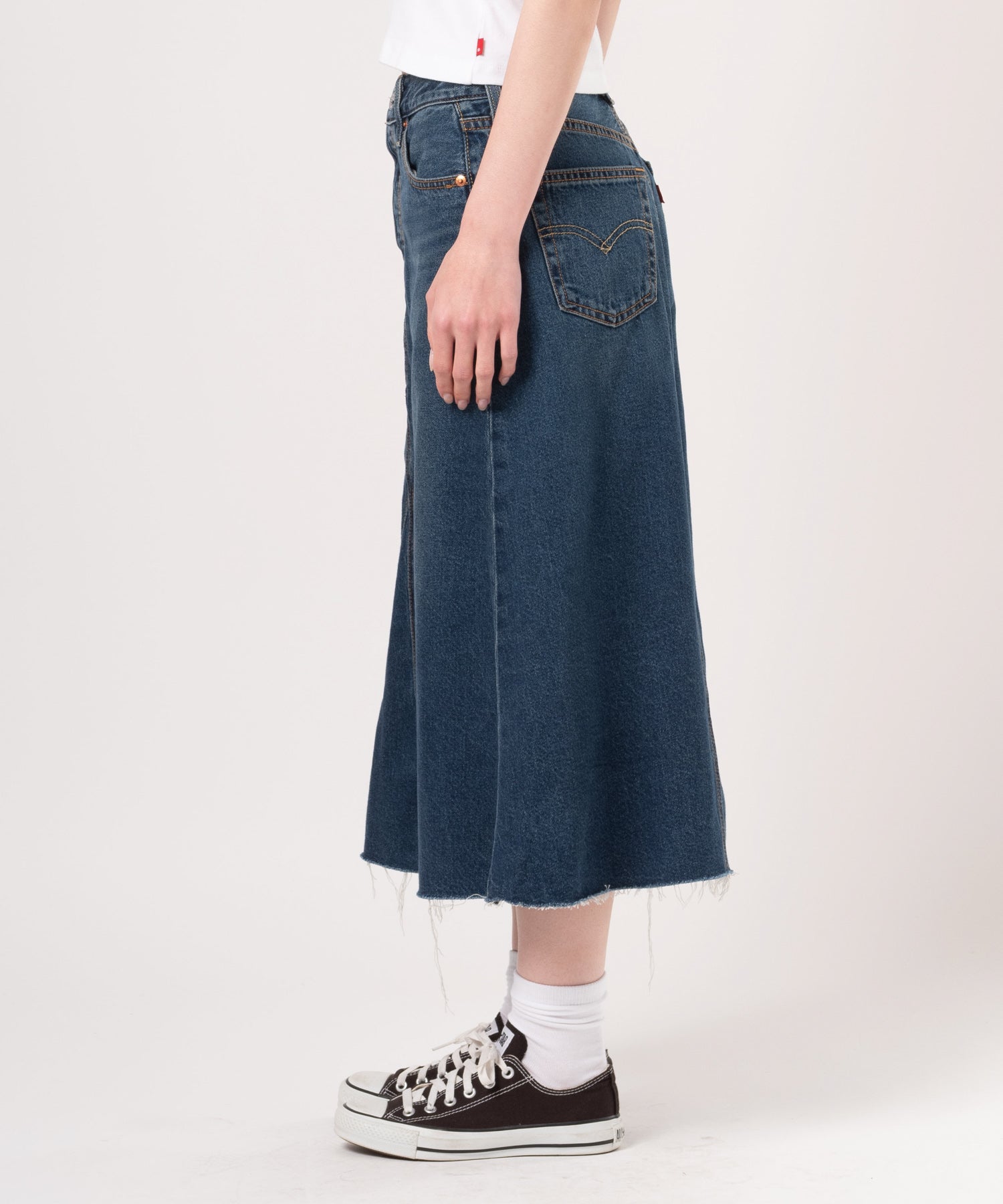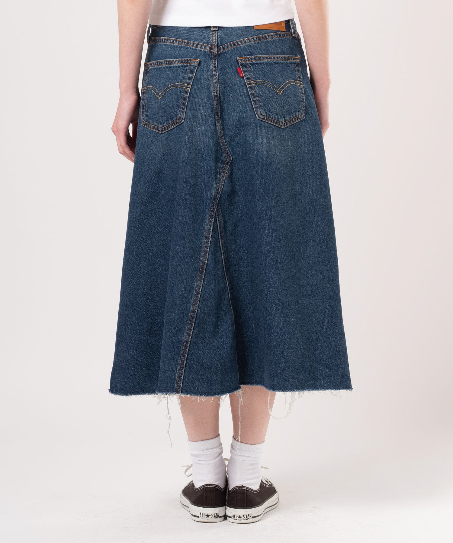 Aラインのデニムスカート。ハイライズ、ひざ下の丈感、再構築デザインが特徴です。オールシーズン合わせやすいダークインディゴ。足元はヒールなどの大人な合わせ方は勿論、スニーカーなどとカジュアルな合わせ方もお勧めの一本です。