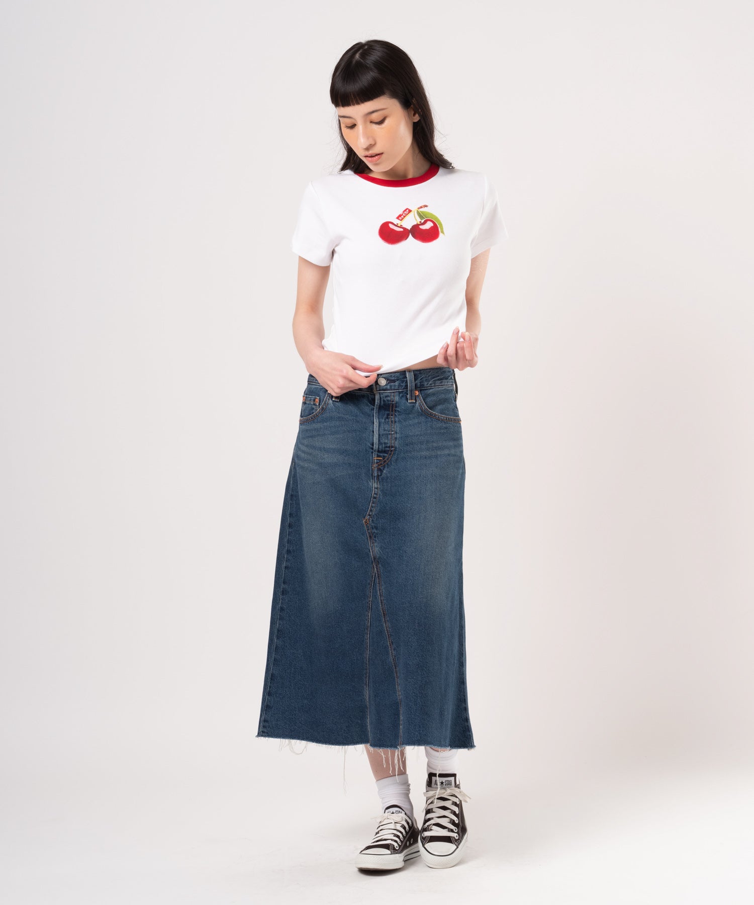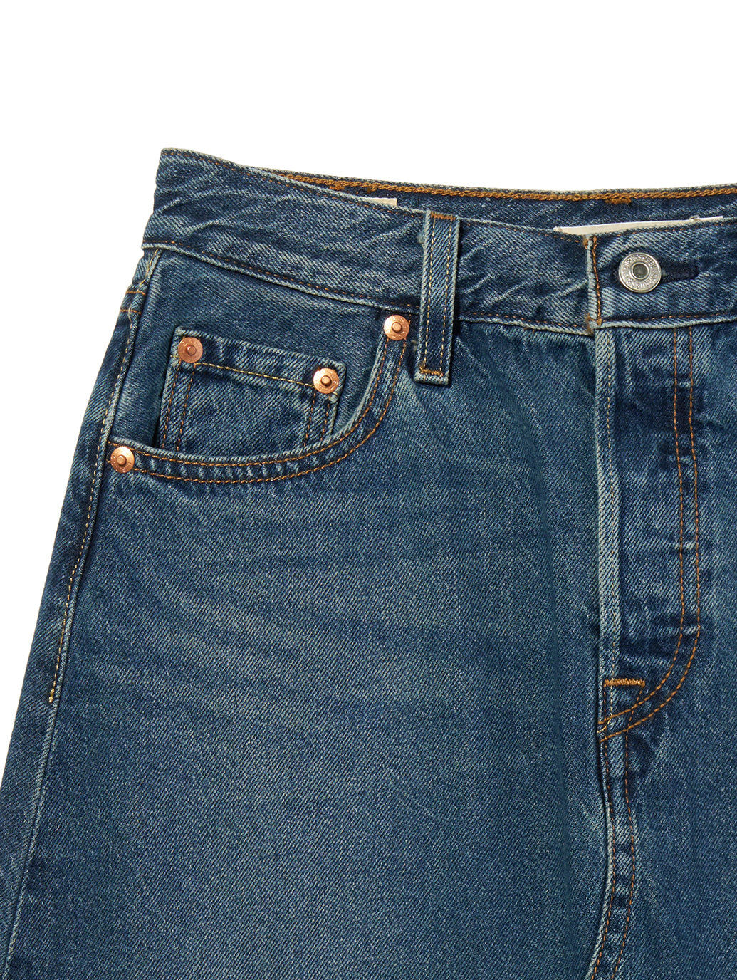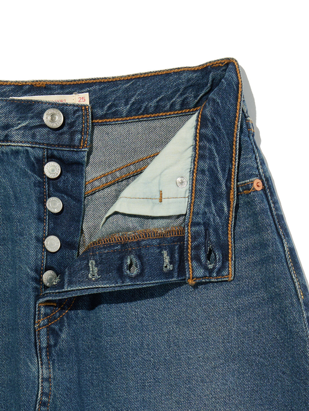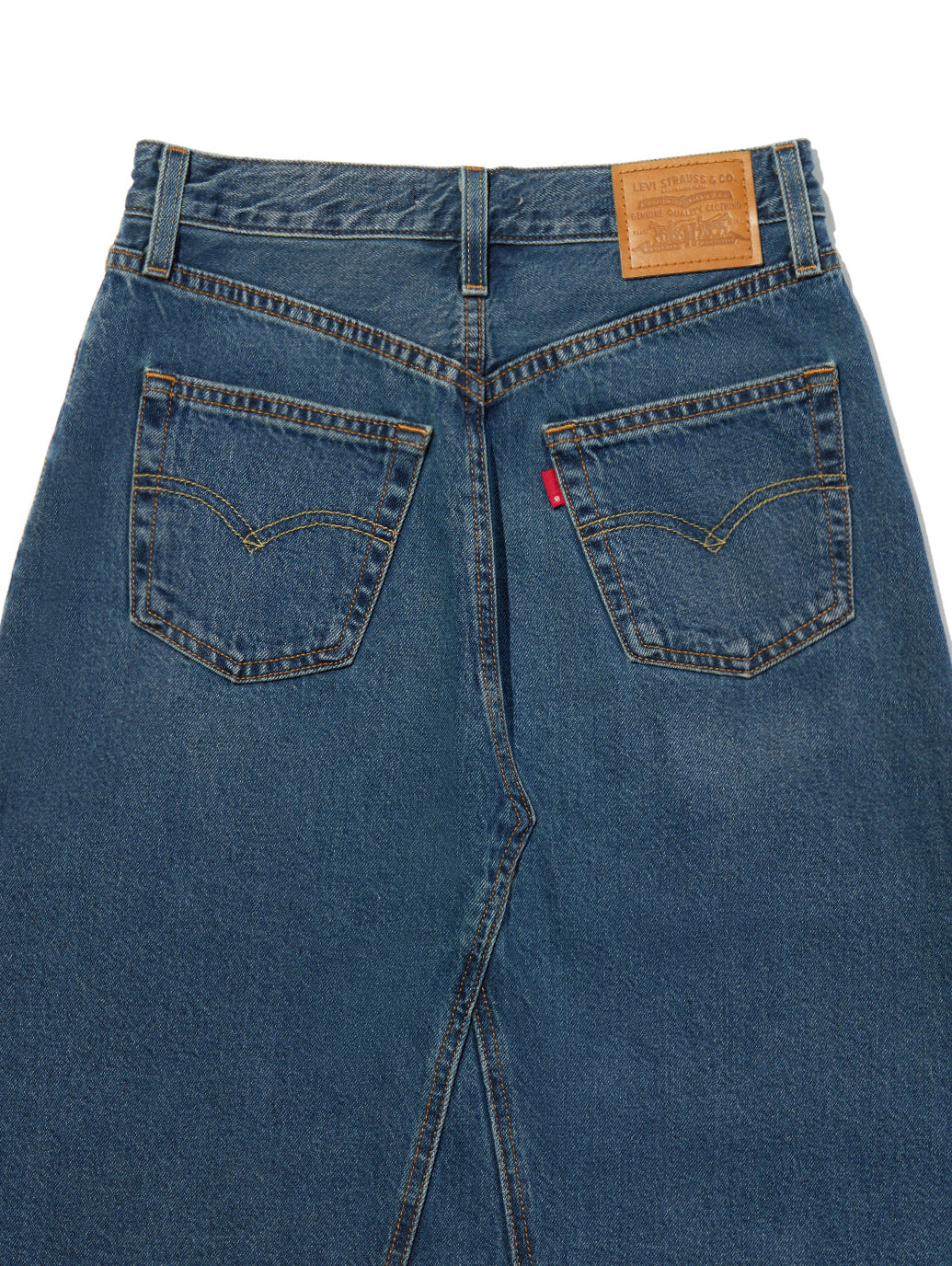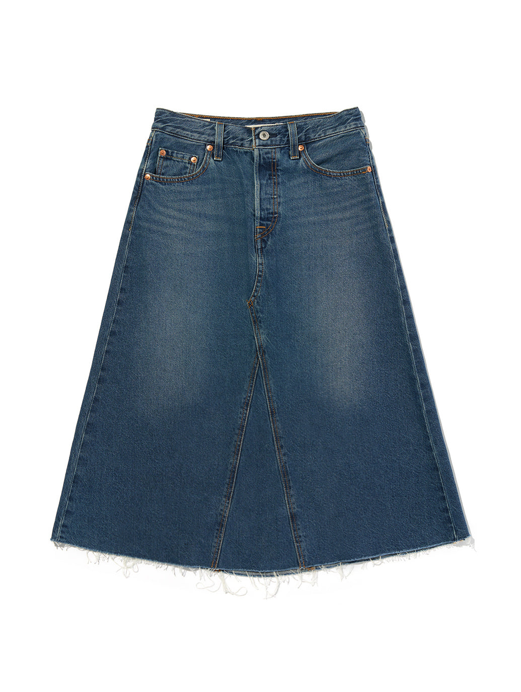 Aラインのデニムスカート。ハイライズ、ひざ下の丈感、再構築デザインが特徴です。オールシーズン合わせやすいダークインディゴ。足元はヒールなどの大人な合わせ方は勿論、スニーカーなどとカジュアルな合わせ方もお勧めの一本です。