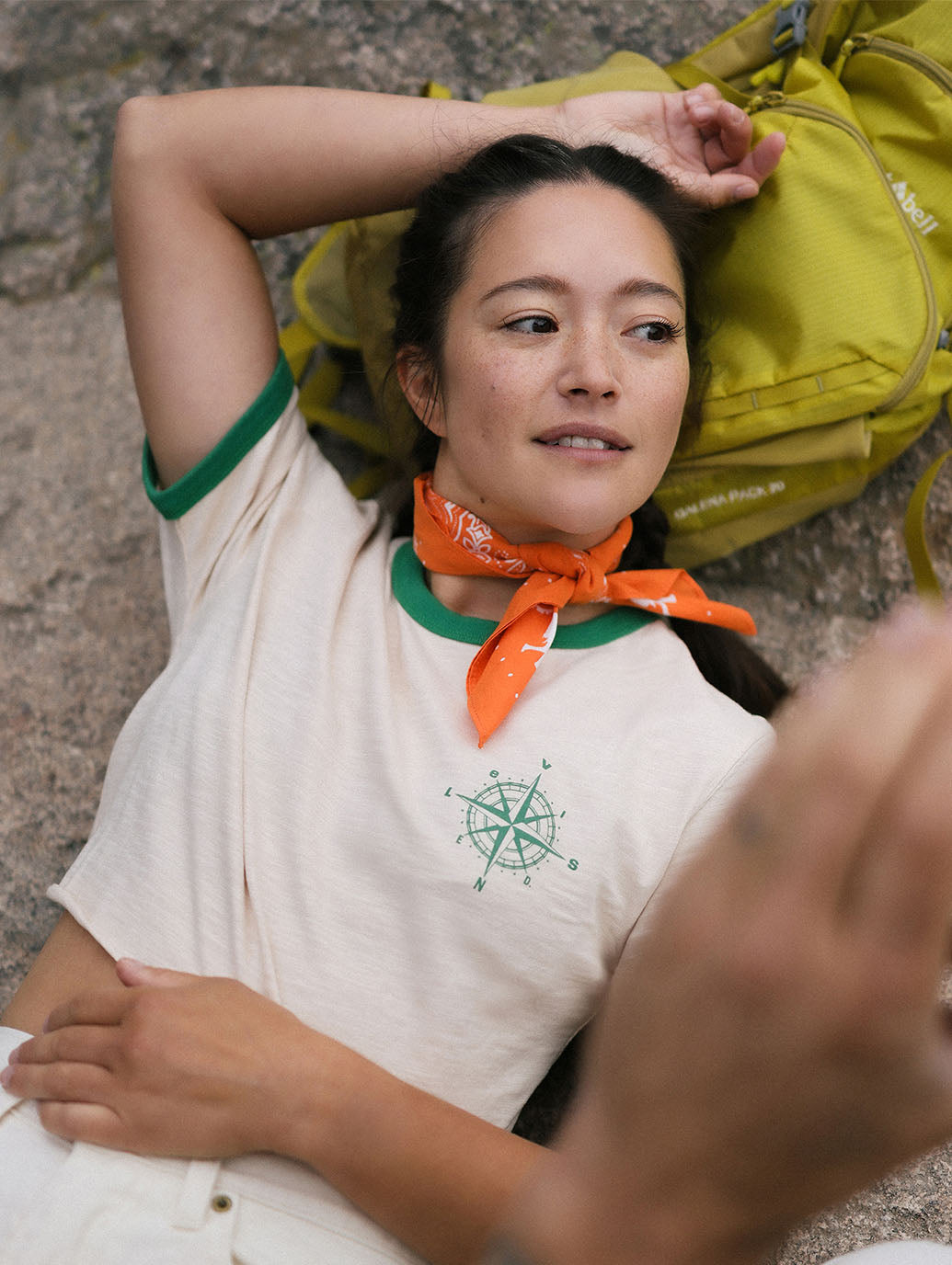 ヴィンテージアウトドアウェアへのオマージュを表現したスタンダードフィットのリンガーTシャツ。ランブラーをイメージしたスケッチ風のデザインで、フロントにはコンパスのグラフィック、バックにはEND.のグラフィックがあしらわれています。ソフトなジャージー素材ですので、気心地も抜群です。